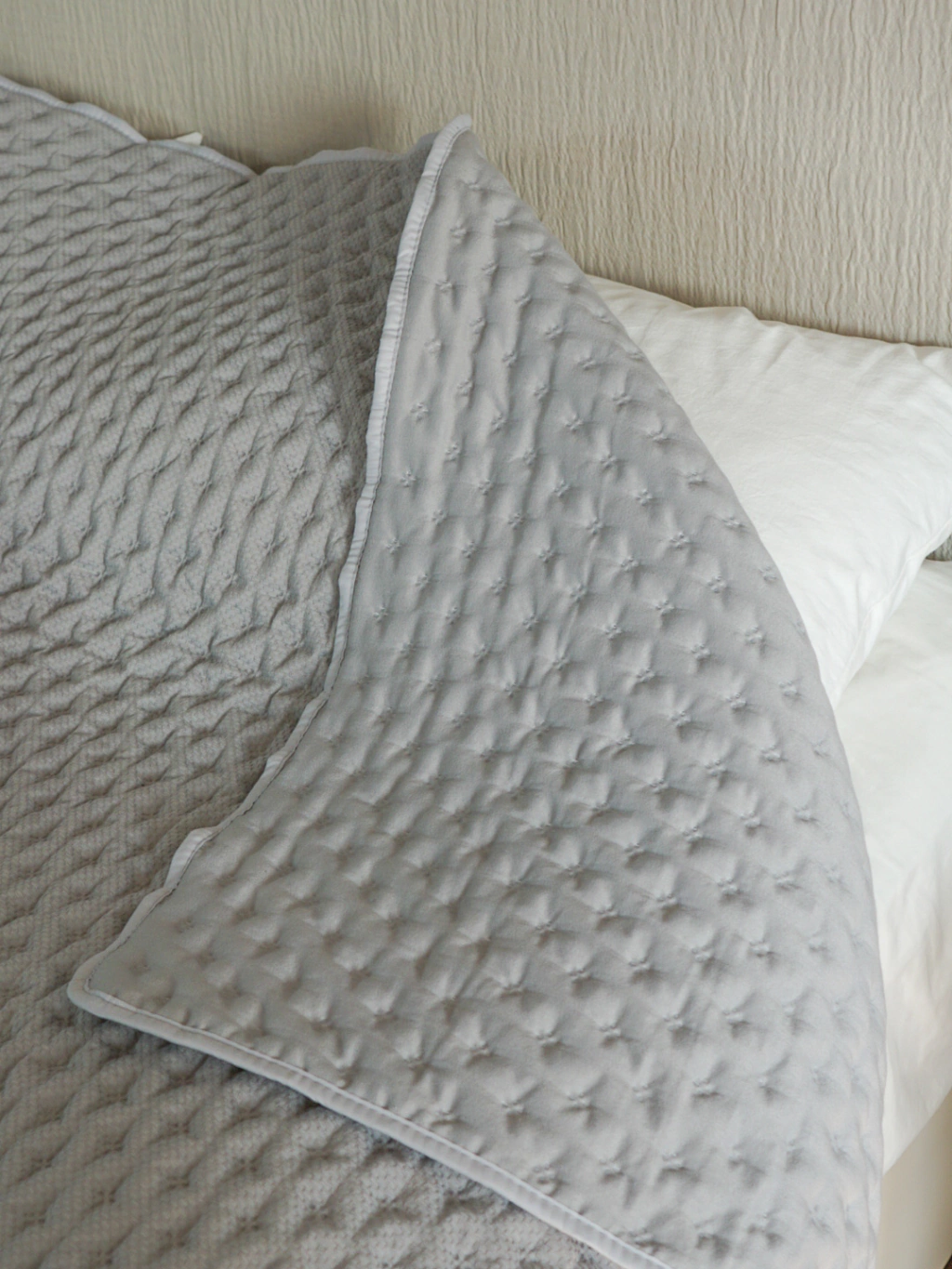Cover tusor rombo spun trama diseño por ultrasonido, reversible con diseño trama de un lado y tusor liso del otro. Ideal para combinarlo con nuestros diseños de mantas pie de cama con almohadones.